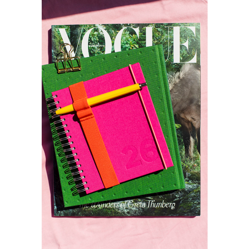 Vävklädd spiralbunden kalender i format A6+ med wire-o i silver. Svenskt kalendarium med namnsdagar, månfaser, veckonummer och svenska högtider. Matchande snodd och spegelpapper. "26" präglat med transparent folie på omslaget.