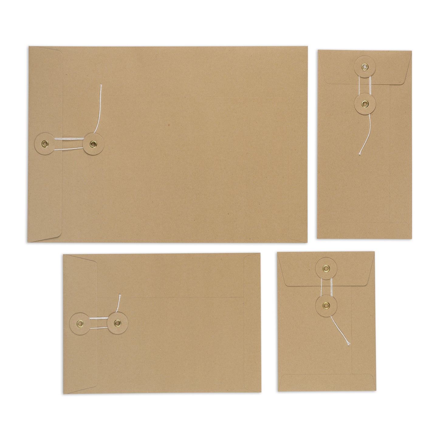 Bruna kuvert av stabilt kraftpapper i C6, C5, E65 och C4. Snörförslutning som gör själva öppnandet högtidligt.