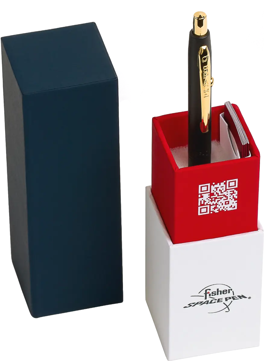 Paul Fishers rymdpennor användes av NASA redan i den första bemannade uppskjutningen i Apolloprogrammet 1968. Tryck på pennans ovansida för att skjuta fram kulpatronen och på pennans sidoknapp för att släppa tillbaka patronen. Den trycksatta patronen skriver i regn, hetta, kyla, alla vinklar och självklart i rymden!