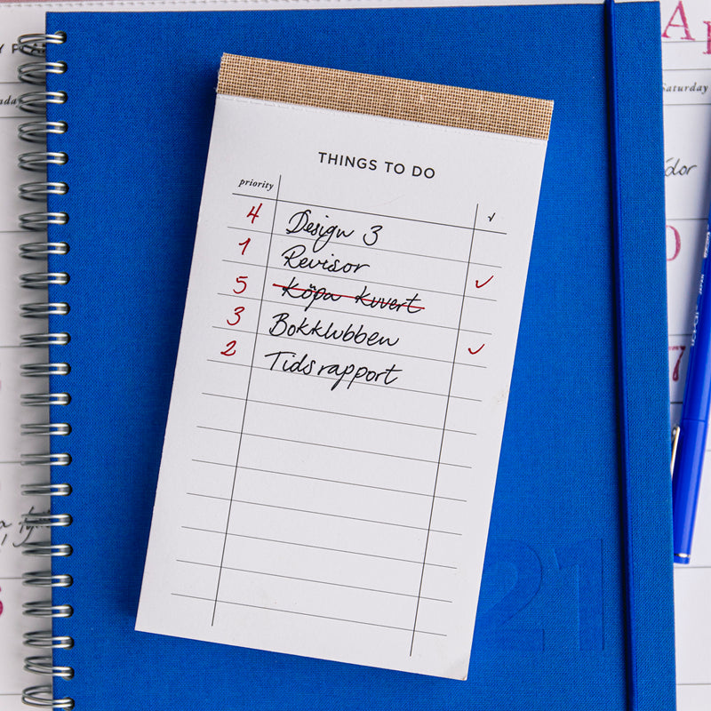 Ett fint block med kraftiga, avrivningsbara perforerade blad för dina shoppinglistor. Schweizisk bindning upptill täckt med bokbinderiväv.